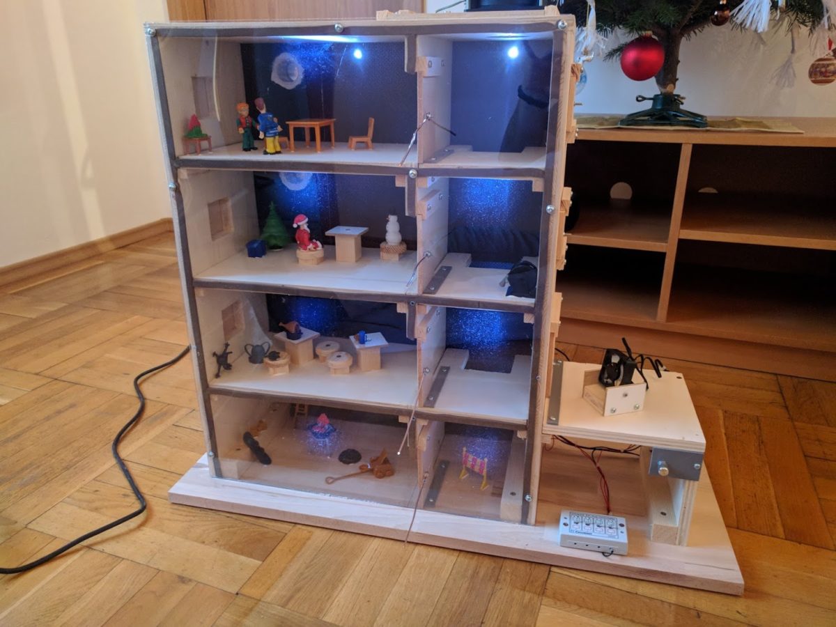 Mit den Holzplatten und Leisten wurde ein Haus mit Stiegenhaus, 4 Stockwerken und Keller gebaut.