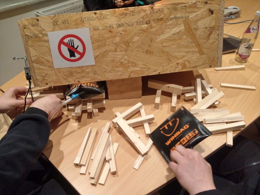 Mittels kleiner Hebekissen aus dem Baumarkt kann man an einem beliebigen Modell das Verhalten des Gesamtaufbaus testen. Es fällt leicht verschiedene Varianten des Hebens zu probieren ohne der Gefahr Schaden zu verursachen.