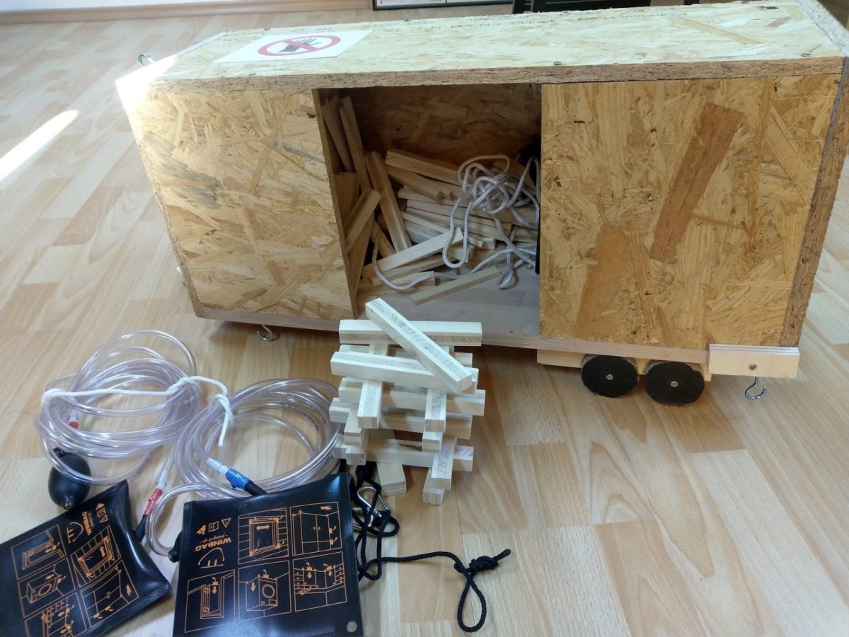 Mittels kleiner Hebekissen aus dem Baumarkt kann man an einem beliebigen Modell das Verhalten des Gesamtaufbaus testen. Es fällt leicht verschiedene Varianten des Hebens zu probieren ohne der Gefahr Schaden zu verursachen.